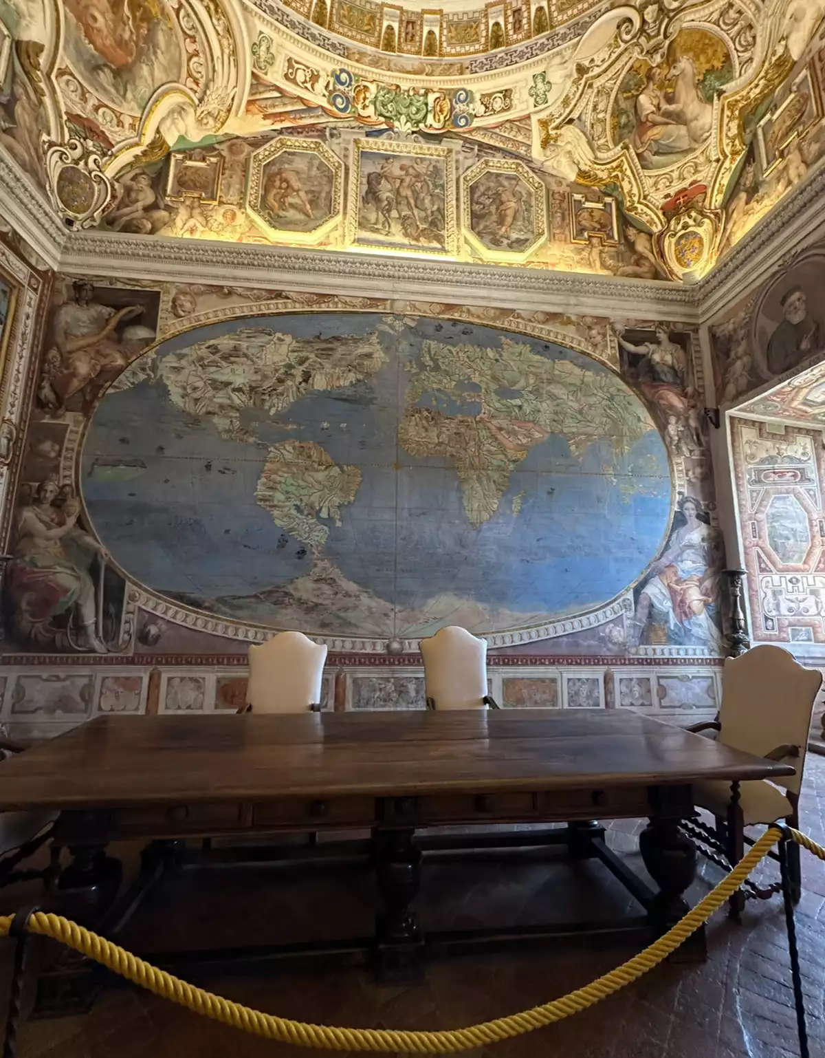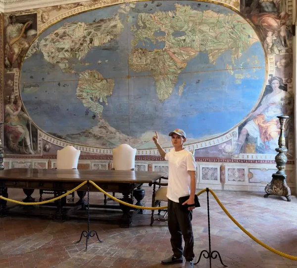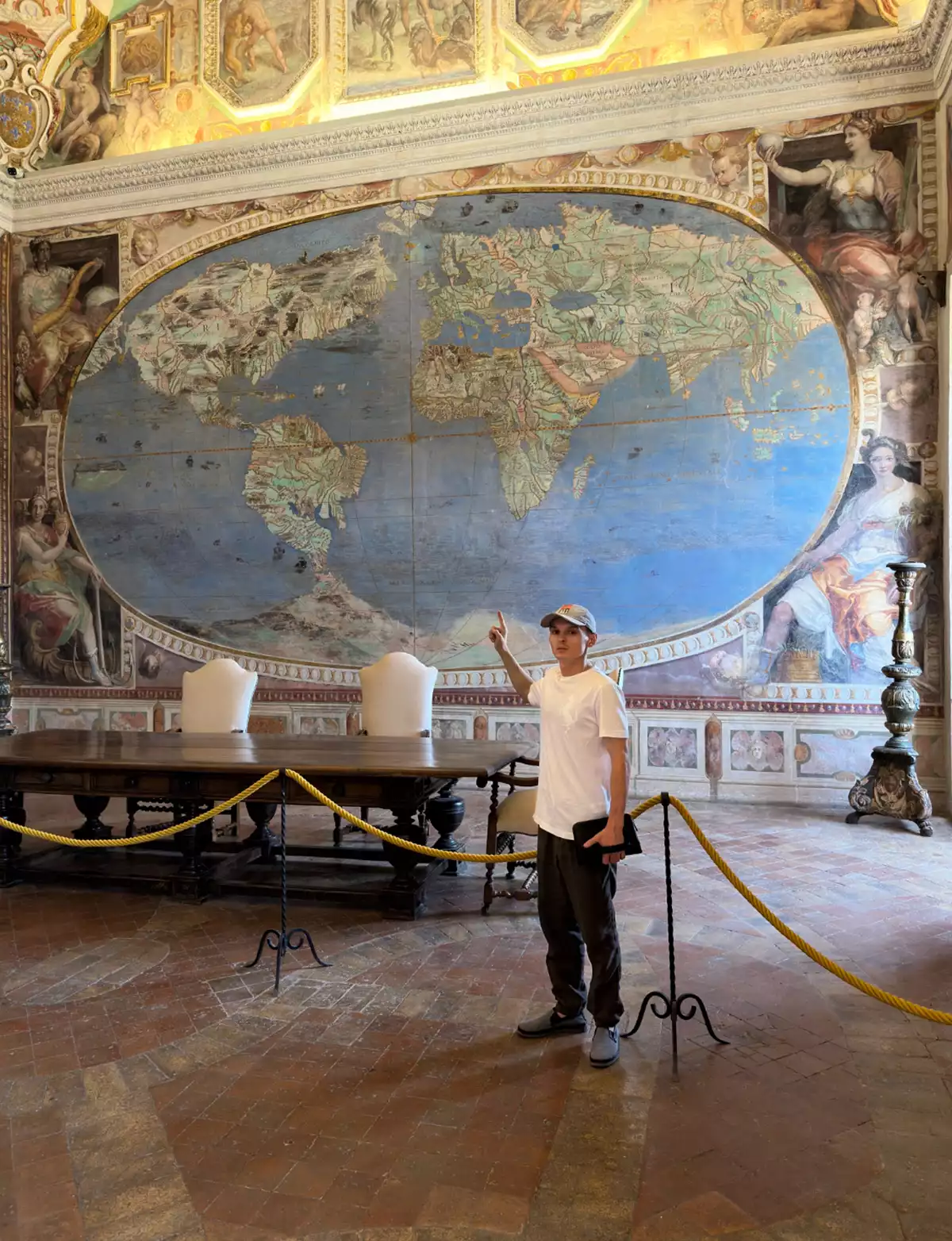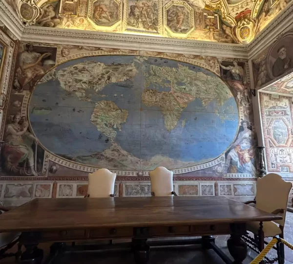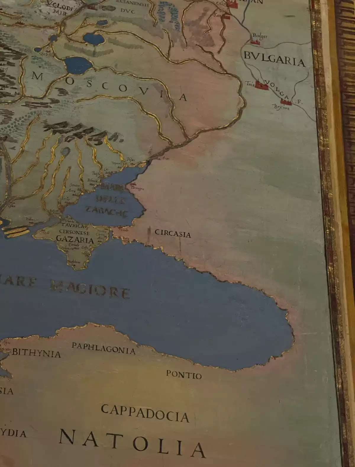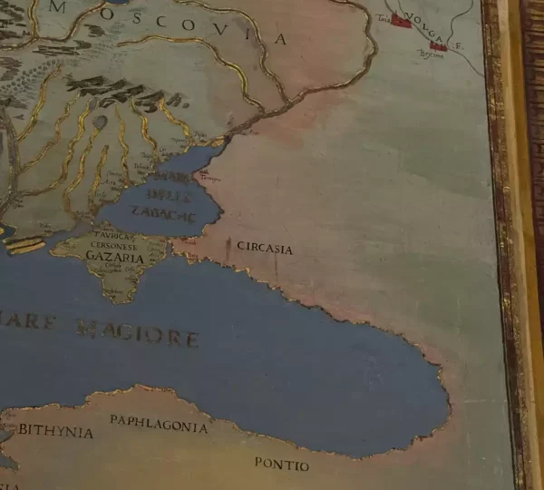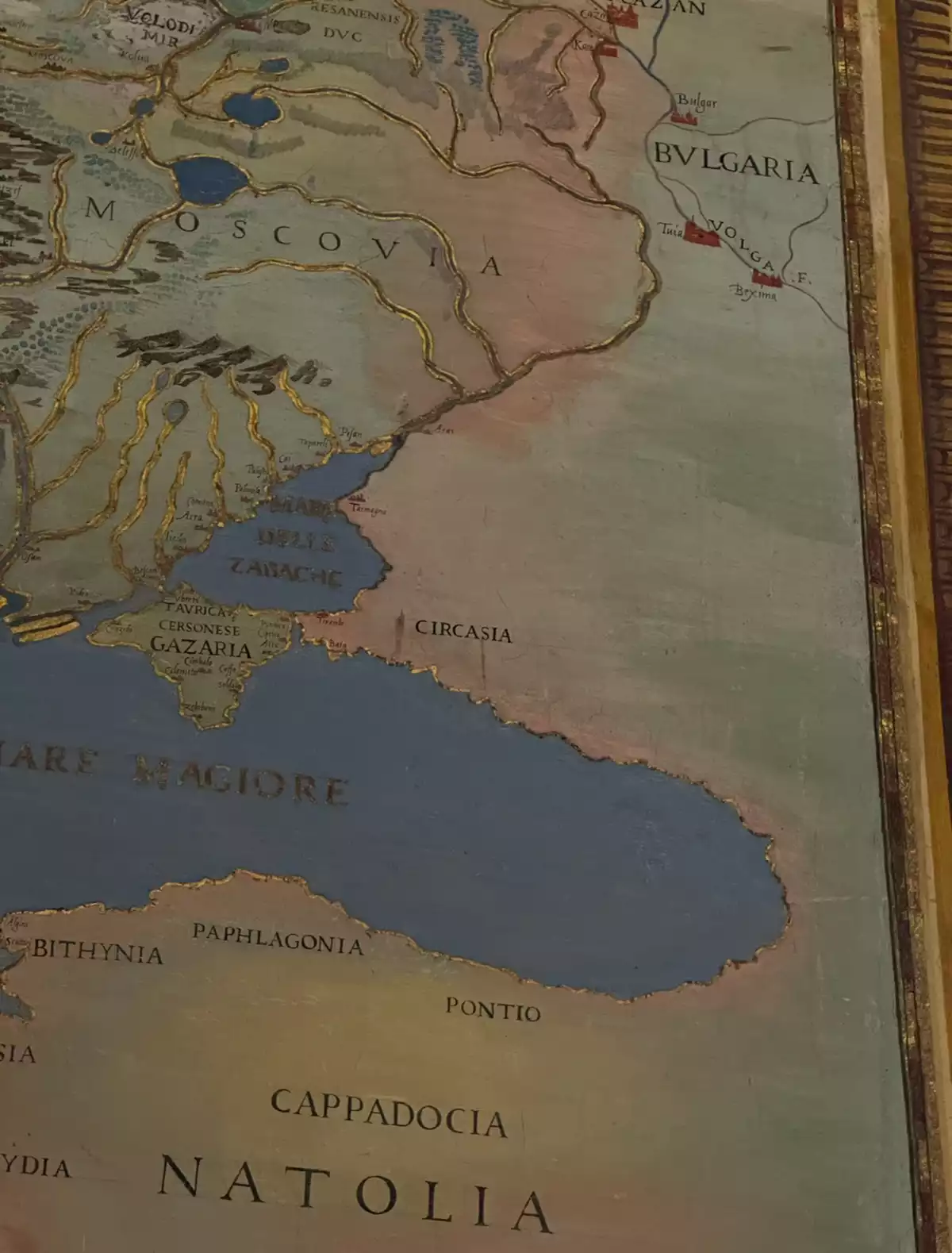 Villayı ziyaretimiz sırasında, benzersiz tarihi haritaların bulunduğu bir salonda bulunduk. Bu haritalar, Rönesans dönemi olan 16. yüzyıla tarihlenmektedir. O dönemin coğrafi ve politik anlayışlarına dair değerli bir bilgi kaynağıdır. Bu haritalardan üçünde — dünya haritası, Avrupa haritası ve Asya haritasında — Çerkesya’ya yapılan referanslar bulduk. Bu bulguları dikkatlice kameraya kaydettik, bu da araştırma materyalimize önemli bir katkı sağladı.